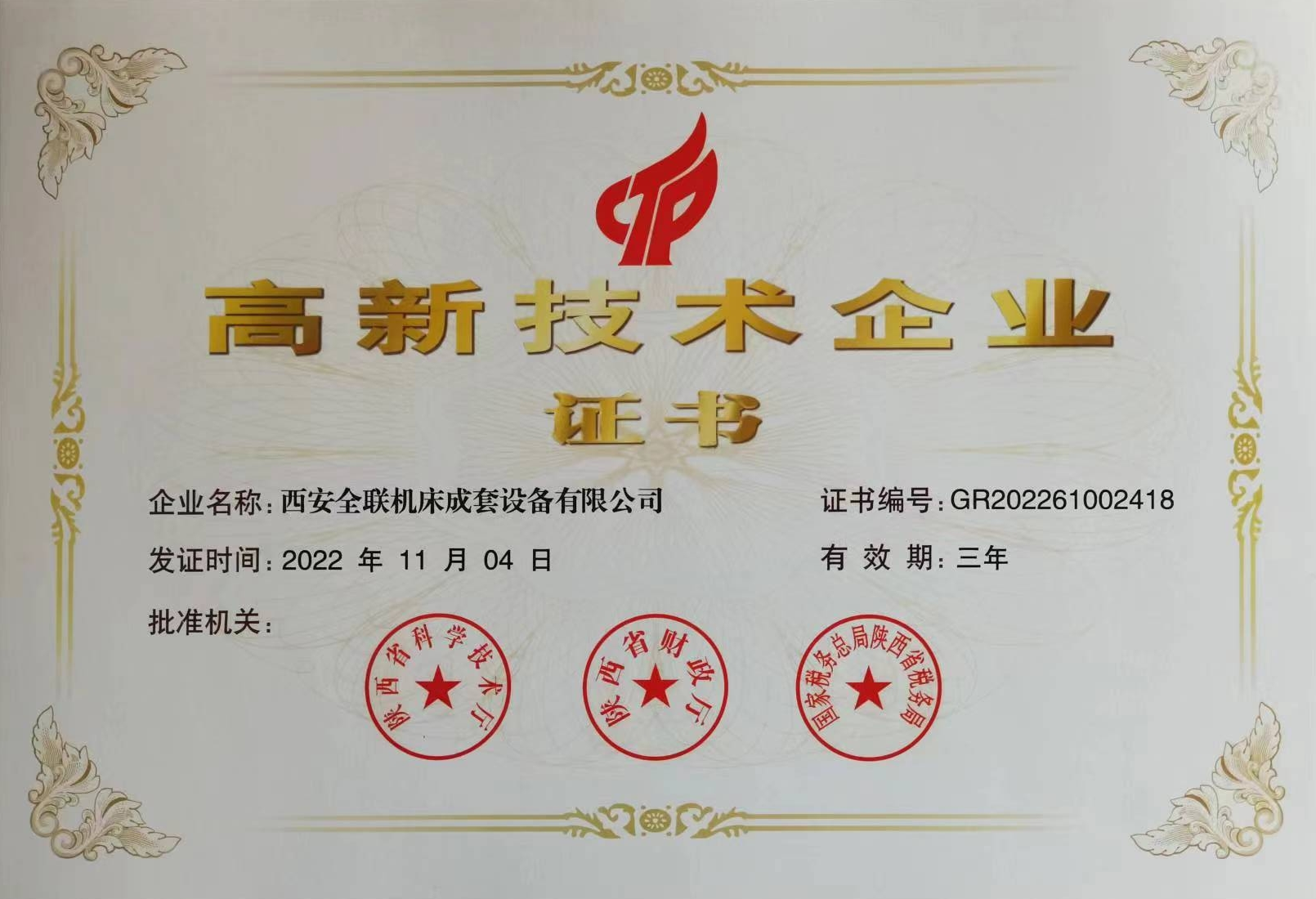 西安宁波优金材料制造有限公司(4G网站)2025年(nian)12月9日榮獲(huò)高新技術(shu)企業證書(shu)